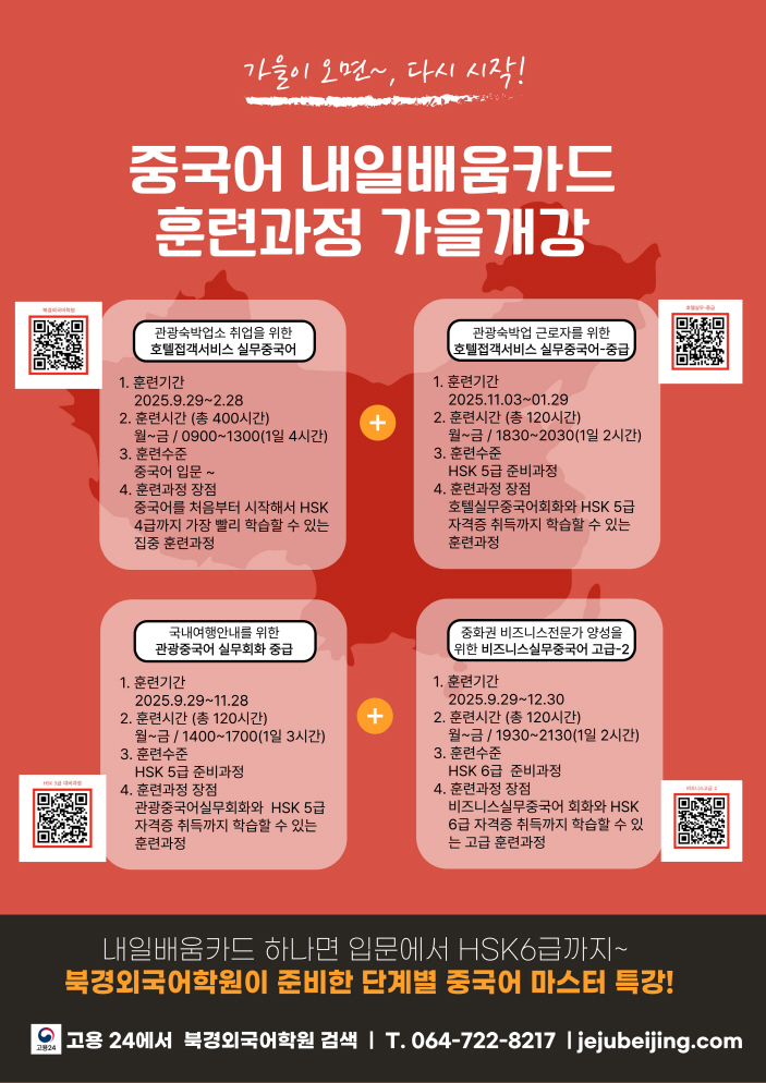 2. 중국어 중급과정 ; 0929~1128, 1일 3시간, 총 120시간. 관광통역회화와 HSK5급 학습. 관련업게 취업이나 중국대학진학, 중국어관광통역안내사시험에 도전할 수 있습니다.