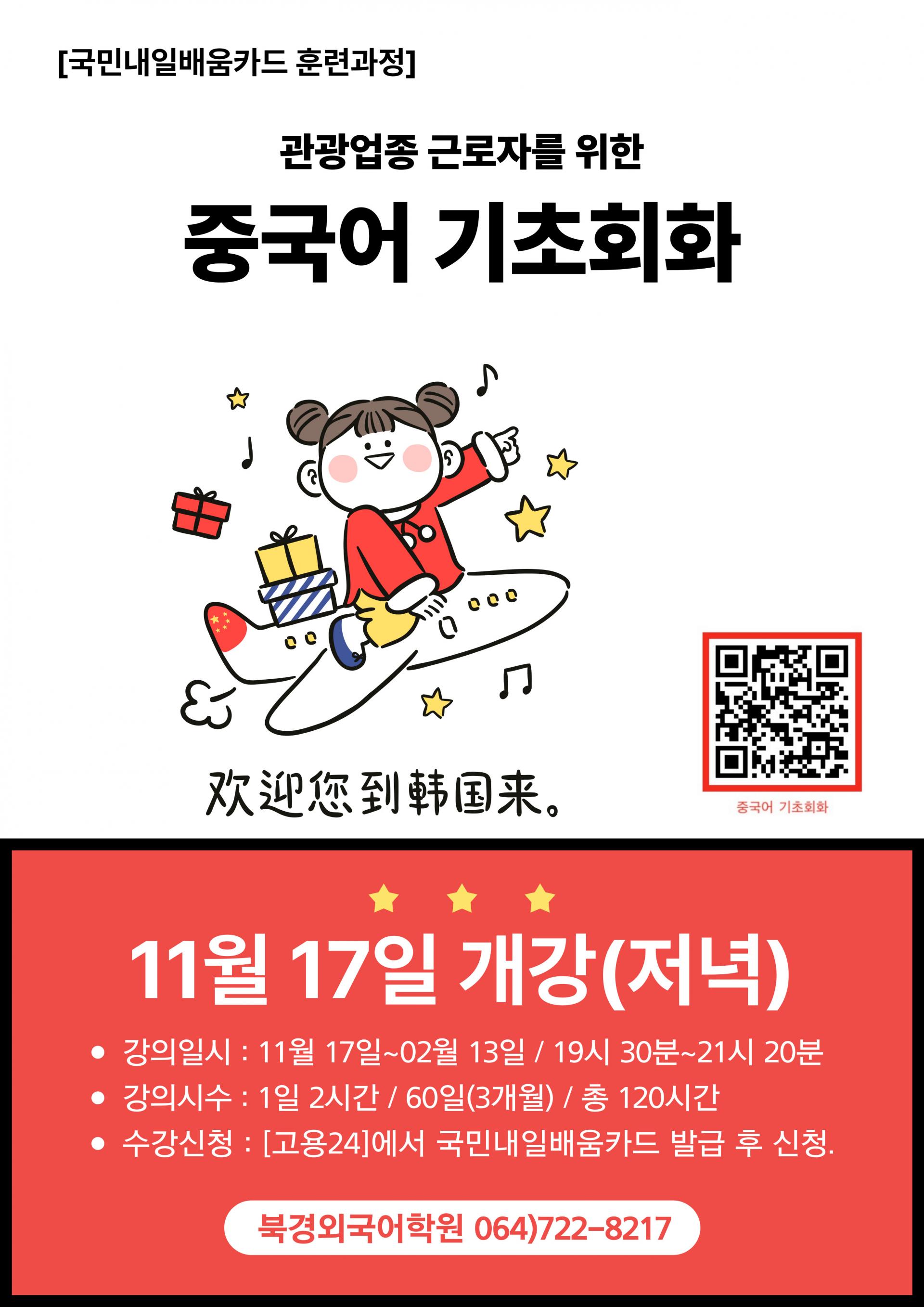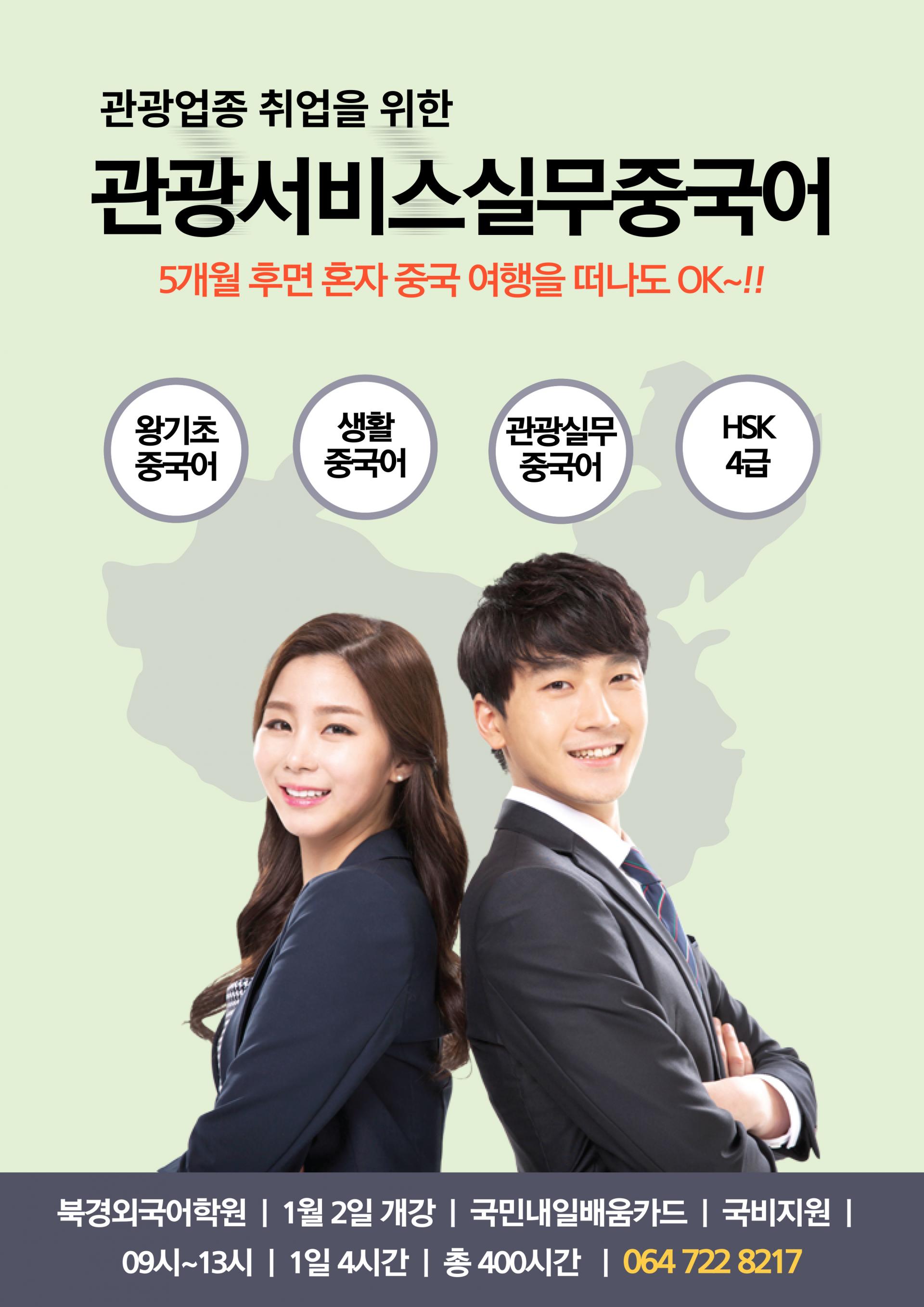 그리고 내년 1월 훈련과정은 오전시간대에 중국어 입문 집중과정인 [관광서비스 실무중국어]과정이 5개월/400시간 일정으로 개강을 준비하고 있고, HSK4급 대비과정인 [호텔실무중국어 초중급]과정이 준비되고 있습니다.